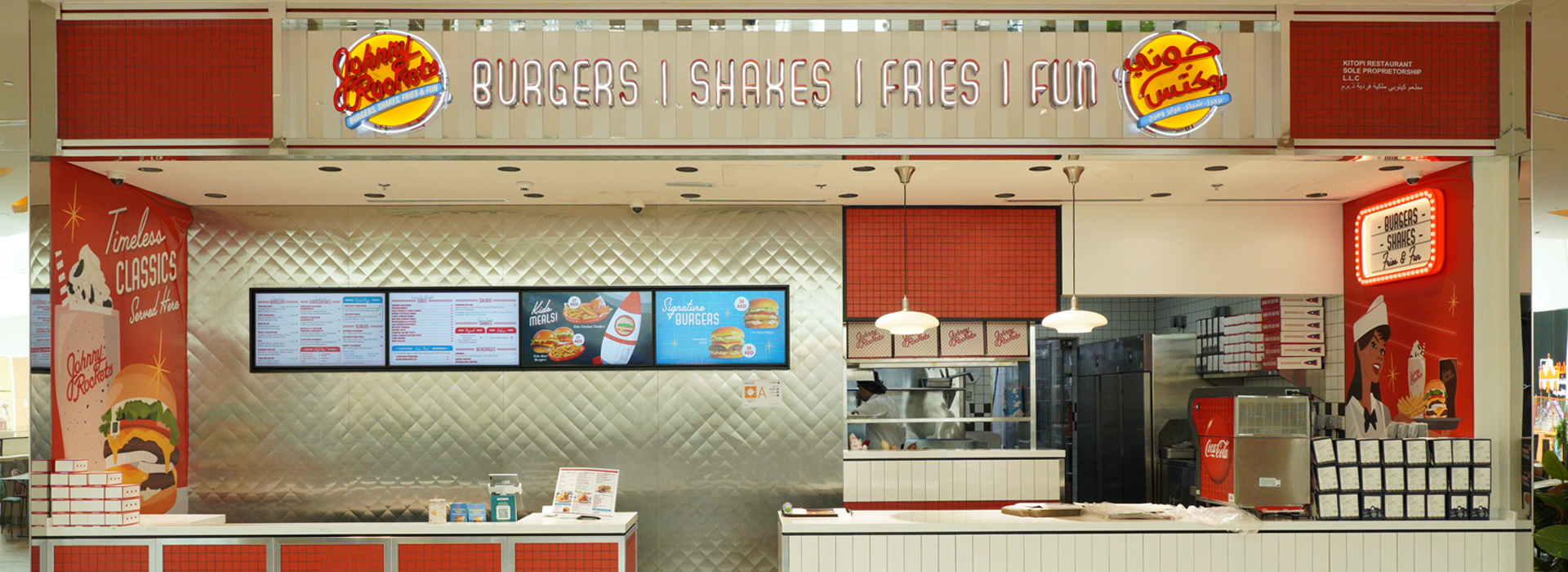 Johnny Rockets is an all- American chain- with 50s diner vibes. We offer burgers, shakes, fries, and fun!